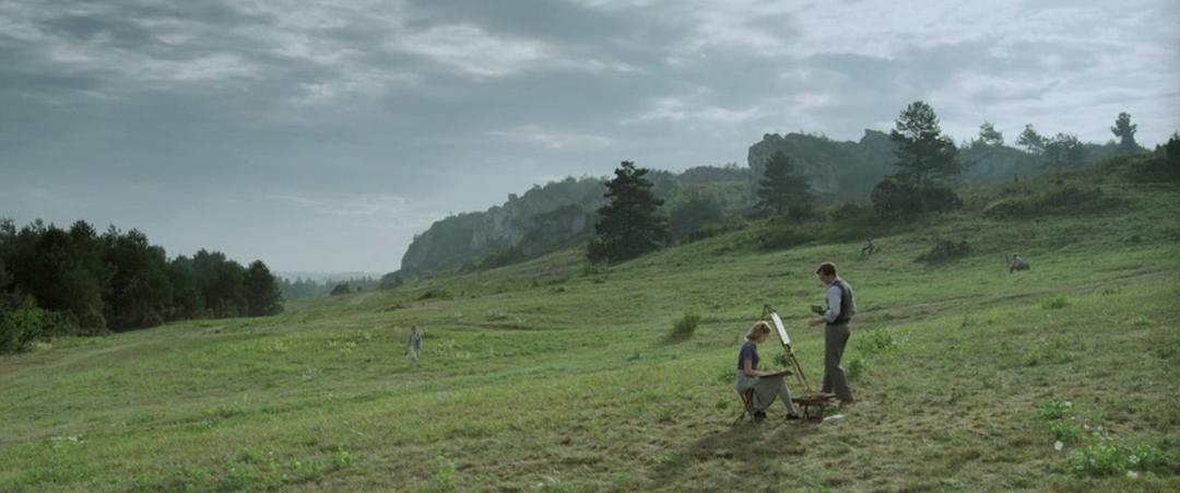 电影的开篇美得让人屏息,一片绿油油的田野上,零星开着朵朵白花,几个年轻人撑着画板写生,不一会儿,他们跟着老师一起抱着双臂自由自在地从山坡上滚下来,嬉笑玩耍,与自然融为了一体。在这儿,年轻的姑娘汉娜第一次见到这个对她一生产生至深影响的男人,美术学校艺术史的讲师Strzemiński ,他是赫赫有名的先锋派画家,倡导绘画中的形式主义,也是余像理论的开创者。与大自然的无忧无虑形成强烈对比的,是Strzemiński的独腿独臂,虽然电影并没有交代他身残的原因,但是结合时代背景不难猜出来这是一战在他身上留下的罪孽。而这片田野的视角构图其实也是一道隐喻,似乎从一开始就预示了他的命运。