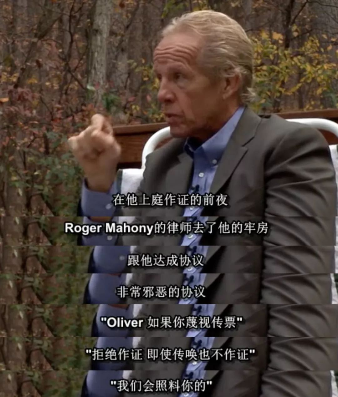 在Oliver上庭之前,主教Roger Mahony的律师去他的牢房跟他达成协议,授意Oliver蔑视传票,拒绝出庭,教会的人自会“照顾”他。