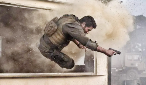 而为了合理化海豹突击队员以一敌十的能力——除了后来主角单枪匹马潜行玩个人solo的段落不提(这段场景中的近身格斗设计得非常精彩),其实镜头中已经给了很多扎实的细节来展示小分队的团队战术素养。