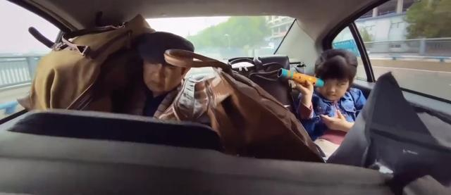 结局时,三代人挤在狭窄的出租车里一起吃饺子