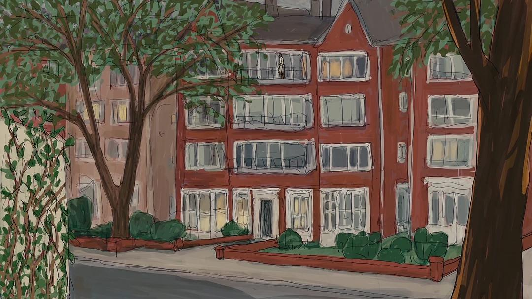 色彩诡谲,画风充满线条感。教授住的????,是4层临街别墅,门口有大树乘凉。虽然房子可能是租的。