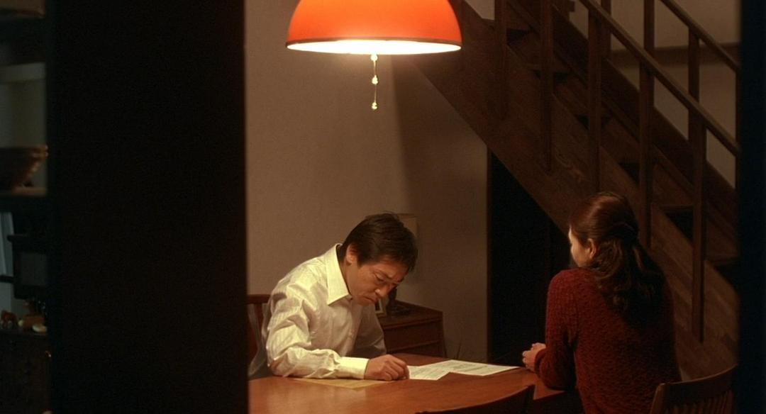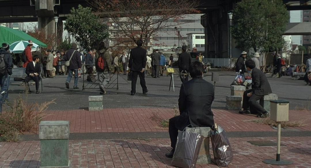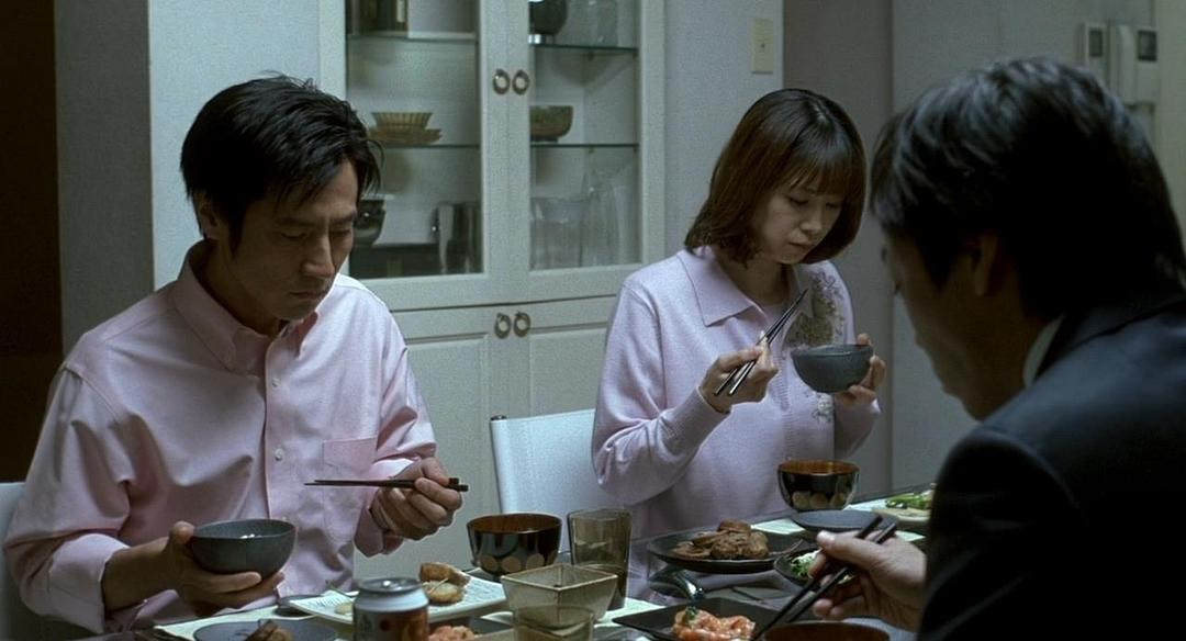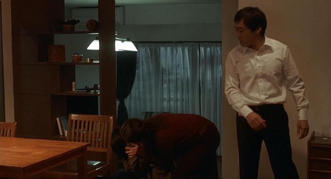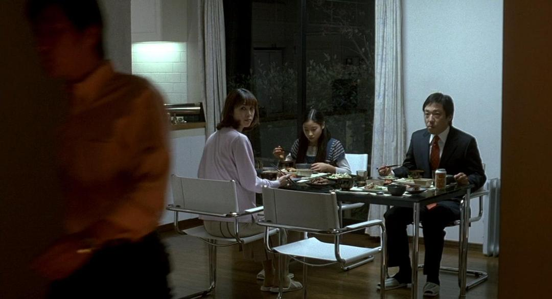 黑泽清这部家庭伦理剧,无法让人联想到小津安二郎式的传统日本家庭电影,这类电影的矛盾设置是“私人的”,最终解决也多是由家庭内部机制进行调和。《东京奏鸣曲》则更具如《美国美人》般的西方家庭剧特色,家庭中的矛盾是“公共的”,最终则必须依靠外部力量的介入来解决。父亲的失业、母亲的身份迷茫、哥哥的理想缺失,最后矛盾冲突的大爆发则意外缘于一个强盗的介入。在小津的《东京物语》中,外人的角色无足轻重,他们只是顺路过来“嘘寒问暖”,矛盾最终化解则是家庭成员自己的付出与牺牲。在黑泽清那里,家庭的性质不再是构成社会的“单元”了,而是从属于社会被社会所控制、所毁灭的对象。这是社会与家庭力量此消彼长的结果,是现代化的必然。社会高高在上,俯视着一切,家庭只是社会的一个傀儡木偶,家庭依靠社会生存,殊不知,你索取得越多,失去的也就越多。