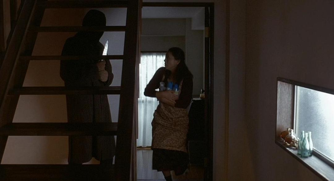 室内戏中,长焦远摄镜头压缩纵深感,将试图逃向消失点的线条囚禁在画框中,努力使景深呈现为一个与电影银幕近乎重合的平面。于是,在我们的观看中,视线所及之处、银幕的表面、被摄空间的正面,几乎被挤压至同一平面。我们的视线不再(像其他导演所做的那样)被虚假地卷入电影的几何学意义上的空间中,而更近似于,像观看银幕一样静观着空间的正面——我们的目光像在抚摸着景深一样。黑泽清的景深镜头实则很大程度上取消了空间的纵深感,空间是拒绝被凝视的,它只能被触摸。因此,或许此时应该说,是电影的空间在看着我们。