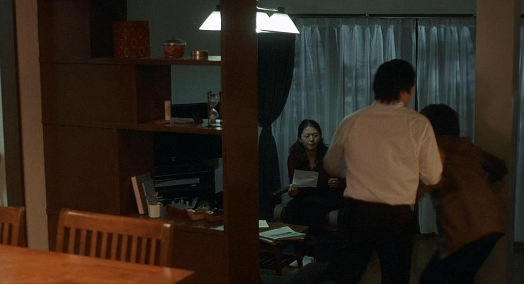 黑泽清所描绘的正是与我们同在的家宅的印象而非空间的形象。在这里,甚至时间都是可以被省略的:开头这场戏,没有经过任何转场的交代,一个剪辑点就把我们带到了另一个场景中,而看到小儿子背起书包去上学时,我们才得知此时已是第二天早上。