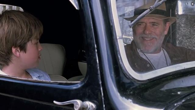 在影片开头,一位留着络腮胡的年轻人翻阅带着漫画插画的图书整理手写书稿,开着与周围格格不入的老爷车来到一片墓地,坐在一个墓碑前,看见一个小男孩从身前跑过,他便陷入了回忆。