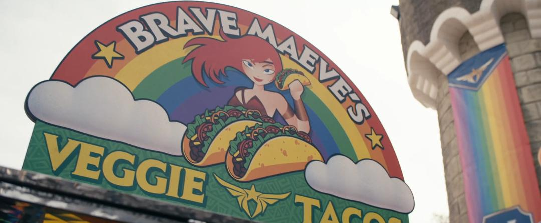沃特乐园的门口写着“勇敢梅芙的包容王国”,并且背景是代表LGBT的彩虹旗。