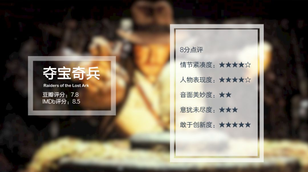 电影延续了斯皮尔伯格商业片的快节奏叙事风格,显然他把这种风格加入到动作冒险电影里非常合适,此后一大波的动作冒险,科幻冒险都采用了类似的叙事结构。当然这个经典的部分,编剧乔治·卢卡斯是有主要的功劳。