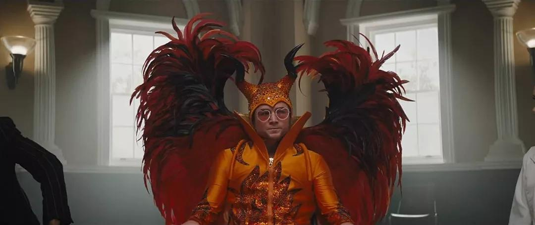 但《火箭人》的开场更为震撼,塔伦·埃格顿饰演的埃尔顿·约翰身穿橙色演出服,背着他在舞台上招牌式的羽毛翅膀,推门闯入镜头。重压之下的他爽约了演出,从后台直接跑到一个互助协会。