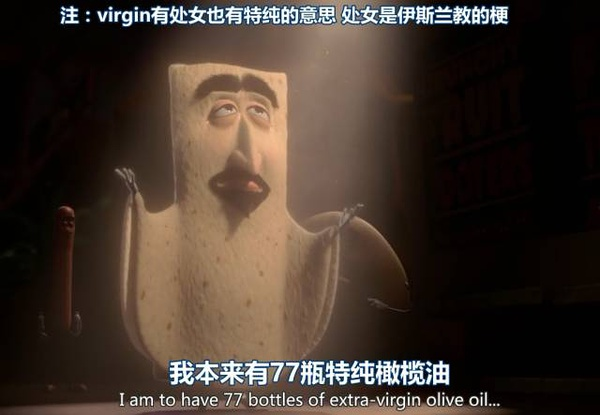 比较明显的文化梗,比如墨西哥卷饼被设定成了一个女同,对面包姑娘一见钟情,一直想跟她啪啪啪。