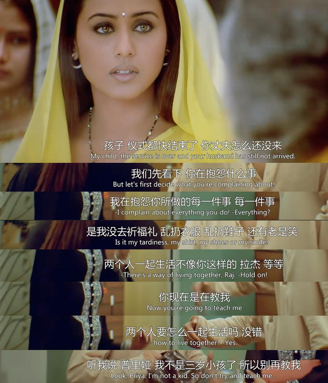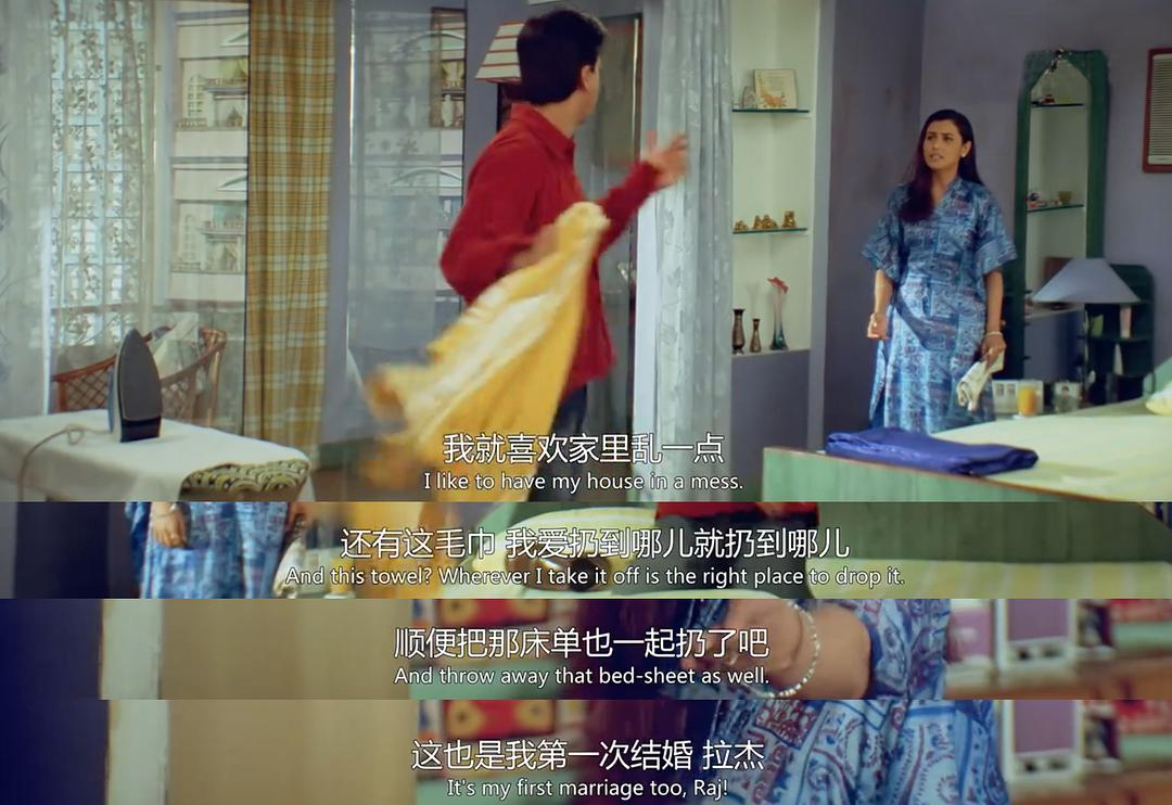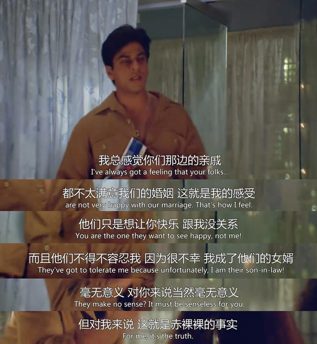 下半场的现实感是我很喜欢的,也是在印度歌舞电影里较为少见的,甚至觉得影片为什么要展现这些鸡毛蒜皮的东西,之后会发现对话中或许有些许人类的共性,实际上片中某个地方通过一对旁人爱侣讨论着便自然开始争吵的行为,对这点也做了二度阐述,爱情并不独一无二,婚姻也是,它们对个体来说或许乍一看是的,但多半时候,都是双方无休止地争执孰对孰错。