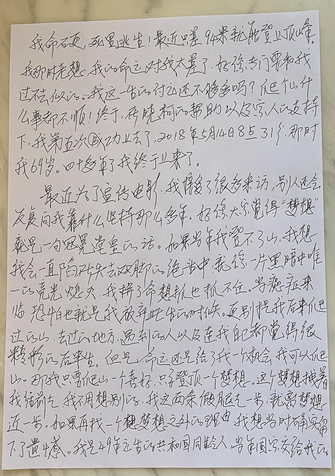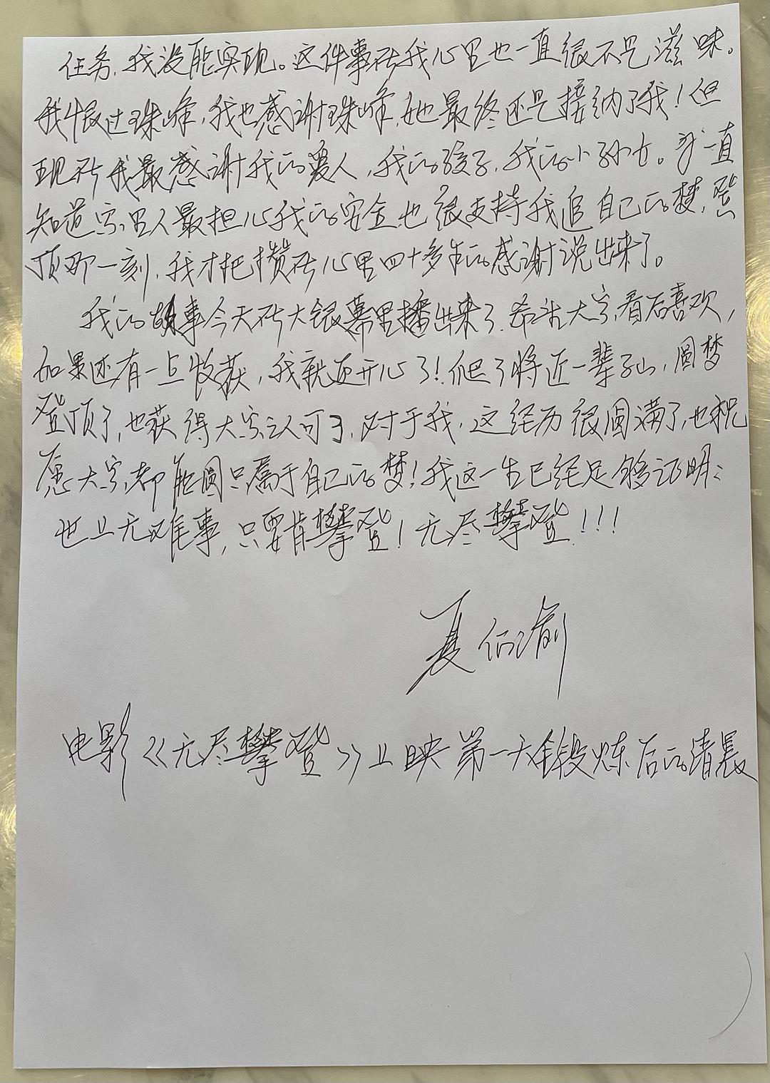 我的故事今天在大银幕里播出来了,希望大家看后喜欢吧,如果还能有一点收获,我就更开心了!爬了将近一辈子山,圆梦登顶了,也获得大家认可了,对于我,这经历很圆满了!我由衷的感谢帮助过、支持过我的每一位,也祝愿大家都能圆只属于自己的梦!我这一生已经足够证明:世上无难事,只要肯攀登!无尽攀登!!!