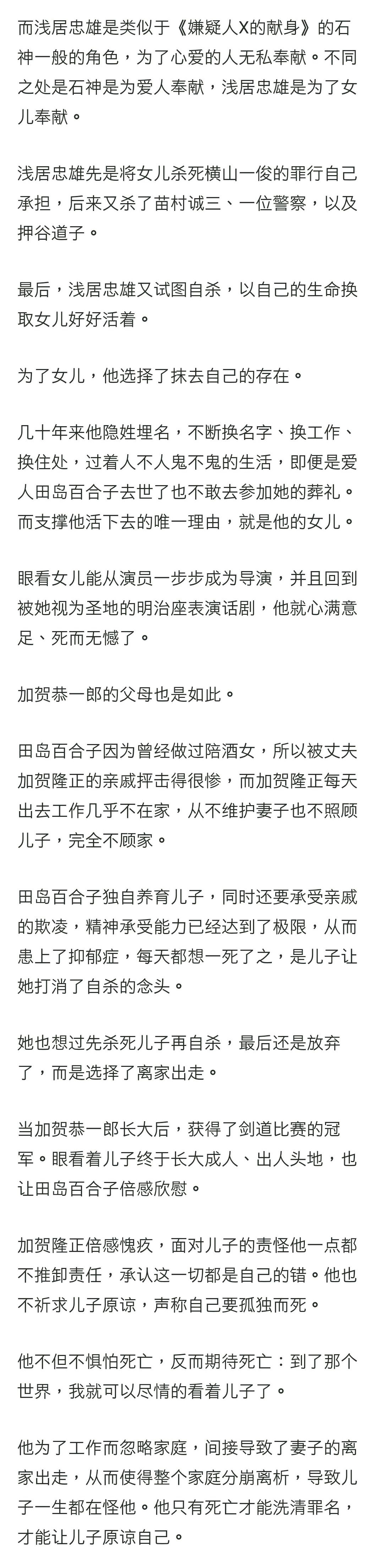 就像《白夜行》、《幻夜》、《嫌疑人X的献身》里的男主角一样,浅居忠雄也是典型的奉献型人格。