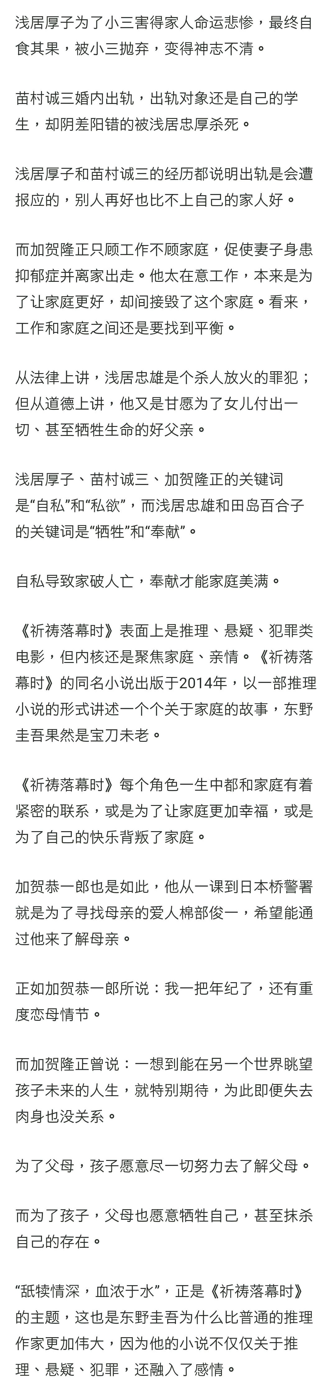 不过,「人は嘘をつく」,人总在说谎。终于,在《祈祷落幕时》里,我们见到了加贺真正压抑着的澎湃的情感。也见到了他那顽石一般的父亲内心里最柔软的角落,无论是他觉得愧对的妻子,还是他恐怕也早就想要在情感上给予补偿的儿子。加贺系列花了十部作品的篇幅遍历人情冷暖,最终还是着落到了主角自己的身上。如加贺所说,“我是不是忘了‘我’?”这轮回如此富有美感,一如电影中浅居父女最后见面的日本桥——天下道路之原点,即天下游子之归处。