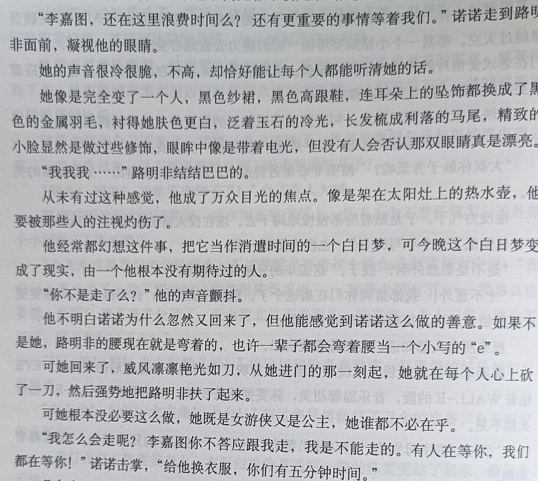 小说中诺诺不少古灵精怪的台词和举止被删改,或许是修订版的锅,令我最不满意的还是“小白兔”那段(福利没了)。小说中,诺诺开的法拉利没油了,便在路边停留,其中有段,诺诺调侃路明非像是“被狗熊拿去擦屁屁的小白兔”,见他可怜想给个拥抱安慰,路明非低着头看见诺诺的“山脊线”,立马害羞并傲娇地拒绝,但我觉得更多是自卑。
