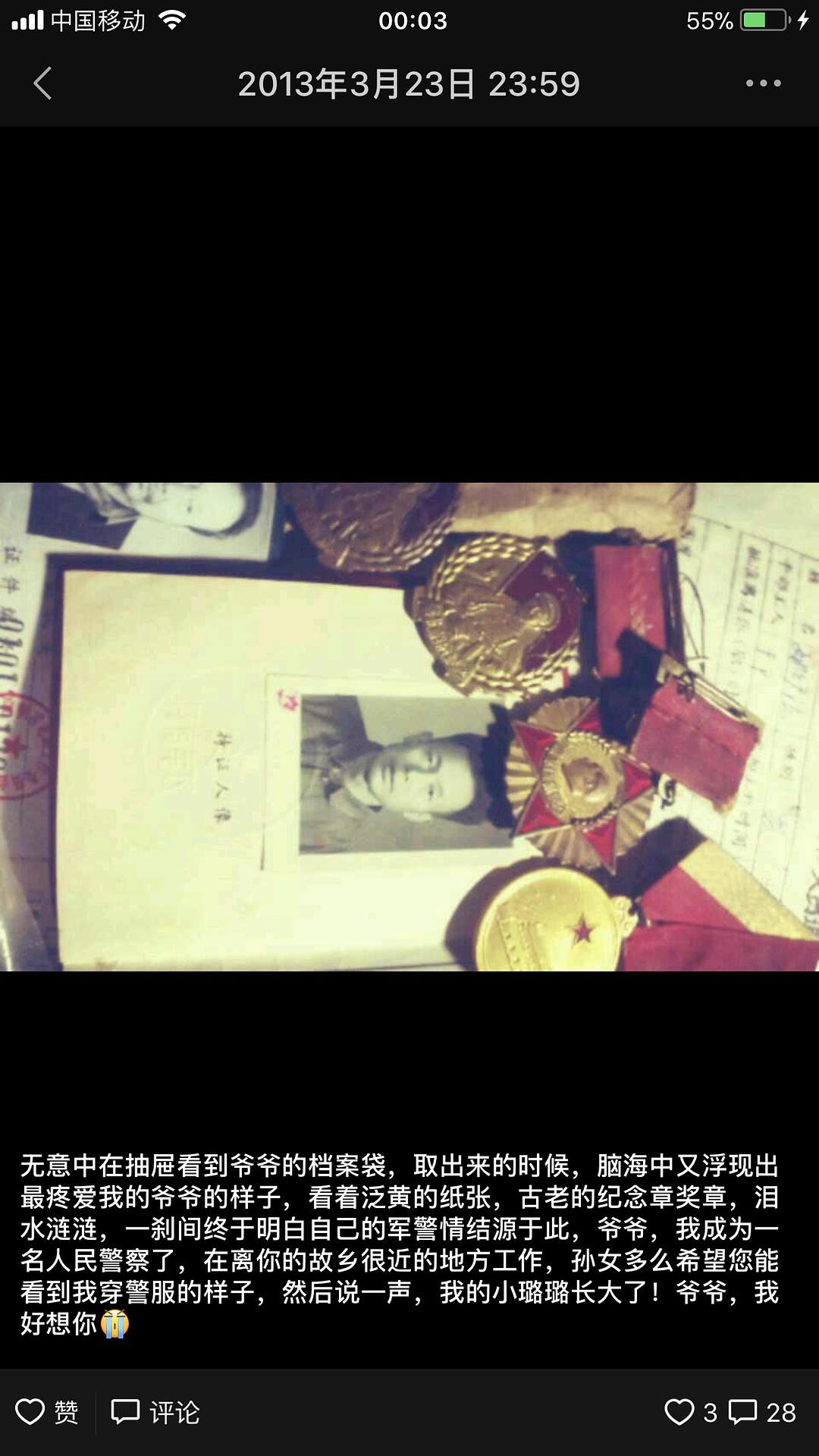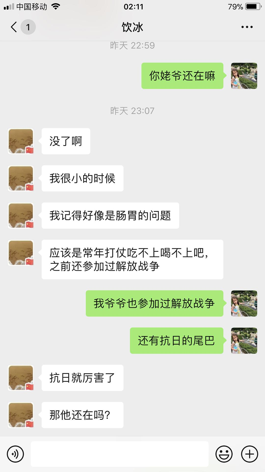 只是他做梦经常梦到打仗,据爸爸说我小时候有一次跟爷爷奶奶睡一张床,夜里爷爷做梦抓着我的脚丫子以为是手榴弹就要投掷,长大后听到这些的我觉得又好笑又心疼,这不就是战争后遗症嘛。那时候不懂,对他心理层面的关心太少,妈妈说,我小时候还是很乖的,爷爷一咳嗽,我就端起痰盂让他吐,给他拿纸擦,帮他捶背,他也特别开心,特别喜欢我,童年时代,从他那里得到的是全部的专属的宠爱,是其他所有堂的表的兄弟姐妹比不了的。