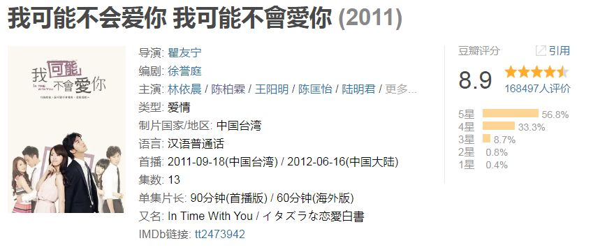 而其中比较有代表性的,《我可能不会爱你》绝对值得一提,随着这部剧的开播,可是非常接地气呢,开启了很多时下热门话题,有关‘30剩女,有关初老,有关恋人朋友……’引起当下年轻人的热议,有关这部剧有很多经典论词,当年最流行的一句话就是“千年修得李大仁”,陈柏霖将李大仁这个角色可谓刻画的细致入微,女主林依晨的演技也自是不用说,她的戏路很广,对各种角色,都可以驾驭得游刃有余,导演的选角也是非常考究,当年他们出演这部剧时,林依晨28岁,陈柏霖27岁,都即将步入而立。对于拿捏初老心态的角色,对他们而言应该是本色出演。