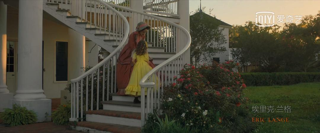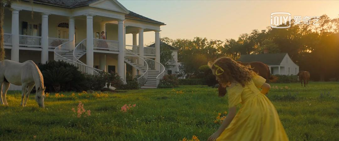 从庄园草坪上无忧无虑奔跑着的白人孩子慢慢移到后花园劳作的黑奴再到田野里被捕杀的奴隶,7分45紫色余晖和深绿色草丛中出片名,夜幕降临。
