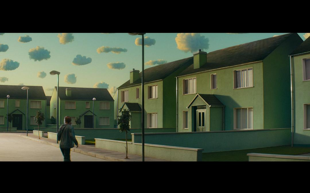 现在回头再审视一下这部电影,看看它说的什么。首先,一个最明显的结论:这电影的世界中存在着某种“奇异”的因素。我称之为奇异,也就是在我们大部分人的日常经验之外的。例如过于整齐、一排排粉刷得完全等同的房屋;永远饱满明亮的太阳和轻飘飘的云朵;包装完好、定期送到、甚至附上简单说明的生活用品……当然,如果说上面这些还只算有些许奇怪乃至诡异的话,Yonder的世界里也有其他一些事物可以说确定是非人类的,例如看似无限延伸实则似乎是原地循环的Yonder社区,迅速长大的孩子,孩子的某些行为与模样(模仿声线算吗?存疑),以及影片最后的奇幻空间,所有其他的9号房……
