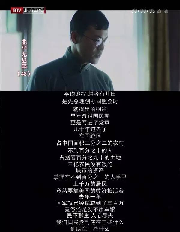 ▲对为赋新词强说愁的年纪来说,子弹并不比信仰崩塌更痛苦。nn真可惜,那是她最痛苦的一刻,也是离蜕变最近的一刻。nn更可惜的是,死后的她还将被继续利用,在当时被国民党老利益集团作为挡住改革的肉盾,后世被编入反映政治黑暗的洗脑教材。nn再有痴似木兰者,愿乌头马角终相救。nnn————————————尾声—————————————nn不知会不会有人发现,每个小标题都是红楼梦《飞鸟各投林》的分句,而最后一句正是:nn好一似食尽鸟投林,n落了片白茫茫大地真干净!nn正像知乎上说的:“徒劳”,是本剧最大的印象。nn这就是刘和平牺牲一切要表达的,与多数年代戏不同的大主题。他创造了这么多,跟十二金钗一样有血有肉的人物,却善恶不分地碾压一番,只留下浮云未散、故人难还的所谓胜利结局。nn事实上在他之前的《雍正王朝》和《大明王朝1566》中应该也有这样的倾向,只是《北平》这样群像的方式更有冲击力。nn即使牺牲主次,作者也不忍心删减任何一个时代剪影的命运。当然这部戏的反响更大,跟《红楼梦》在晚清的风行有着共同的背景,也是要把很多话藏在绕口的古言背后的原因。。。nn仔细分析北平的豆瓣网评,很多低分也并不是因为没兴趣看,而是看完之后的心灰意冷所致。nn就像以色列作家阿摩司·奥兹说的,n“我不是中国历史的专家,我读过一些中国文学作品,我可以感受到那种过重历史负担的痕迹,这对你们的社会体系无益,对你们的任何思想都无益。每一个人都被设计为能够摄入一小部分的历史,一小部分的政治。但如果这些东西必须变得巨大,压制了私人生活的空间,那些真正需要而简单的事物:爱与孤独、失去与憧憬、死还有欲望就会被淹没,这不是一件好事。”nn所以从这个主题来说,愿大家永远不必看懂《北平》。nn有些忘记并不意味着背叛,看不懂前人悲歌,才能做个专注个体幸福的傻子。nn实在骗不了自己的,国庆多读读《曾文正公全集》,学学如何在认清人生本徒劳之后,像王站长一样,进取又无为的生活。nnnn谨以此文,nn献给曾徒劳一世,却不得花好月圆的人们,nn和这差强人意,却来之不易的安稳现世。nn——————————————————————————n本文首发于个人公众号,所以图片带水印~欢迎讨论勾搭~n来个原文链接吧……排版好一点n原文
