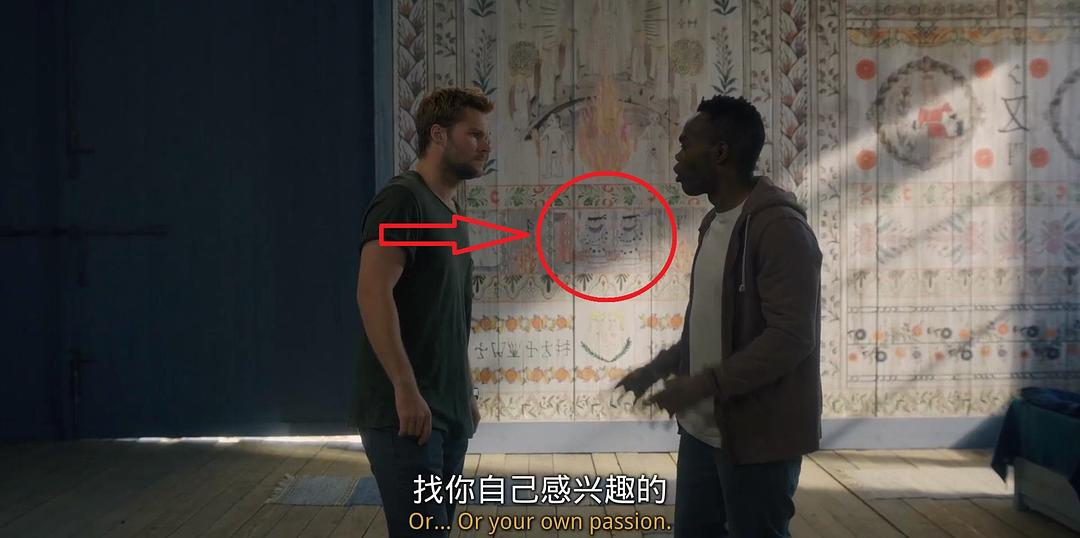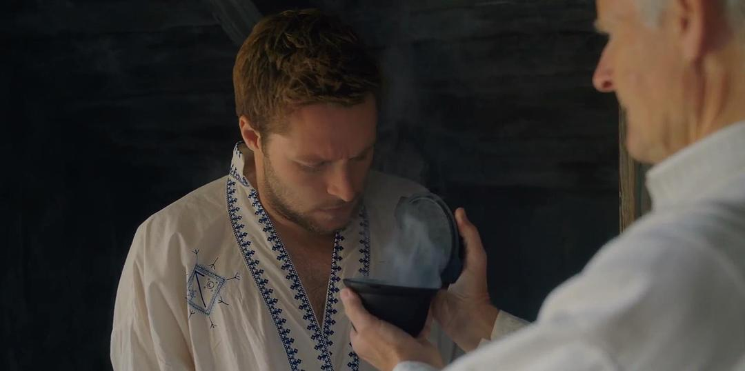如下图,Christian身上穿的衣服秀着一个上身符号。 这个符号来源于古挪威神氏Týr。在日耳曼神秘学中象征着男性与力量。在Chris被选择为new blood与村里的姑娘交配时,不难理解为什么要给他换上绣有Tiwaz符号的衣服了。