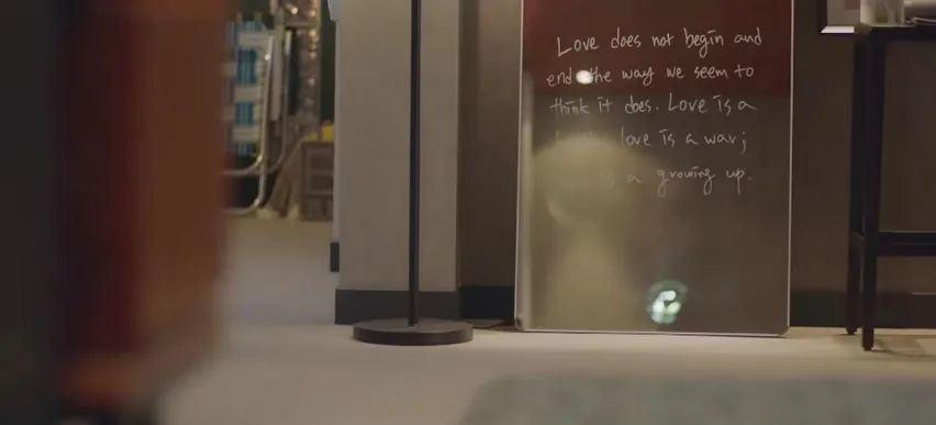 镜子上的一段英文:“爱情的开始和结束从来不是我们所能预料的,爱是一场搏斗,爱是一场战争,爱是一种成长。”结合后面剧情,有隐隐点题的暗示味道。