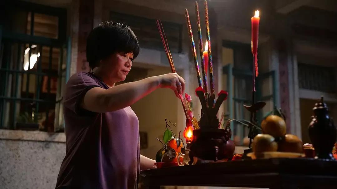 跟邻居斗嘴、卤鹅做生意、做粿拜神明、敬老骑摩托……样样是她生活里熟练的技能。在拍拜神那些戏份的时候,纸钱怎么买,供品怎么摆,先烧香还是点炮,少贤阿姨成了道具组的老大,全部人都要询问她,以她的意见为标准,拜神仪式全流程,她真的是了然于心。