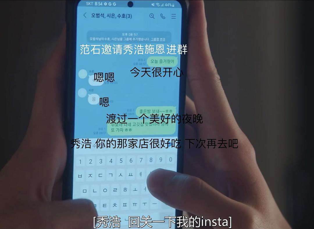 从聊天记录这个小细节就可以看出范石的性格。范石主动邀请秀浩和施恩进群,并且主动表示今晚很开心,秀浩回复了“oo”,施恩回复了“嗯嗯”,范石祝大家晚安并表示希望以后再一起去。秀浩和施恩没有回复。秀浩和施恩的慢热和不善言谈也为日后三人的争执埋下了伏笔。