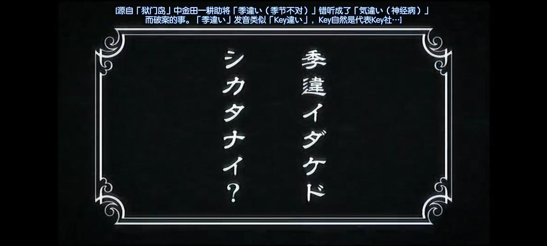 9、“搞错那个key啦,不过也只好认了”,这一句与“季节错了真是没办法”谐音。这一谐音梗出自金田一系列《狱门岛》。