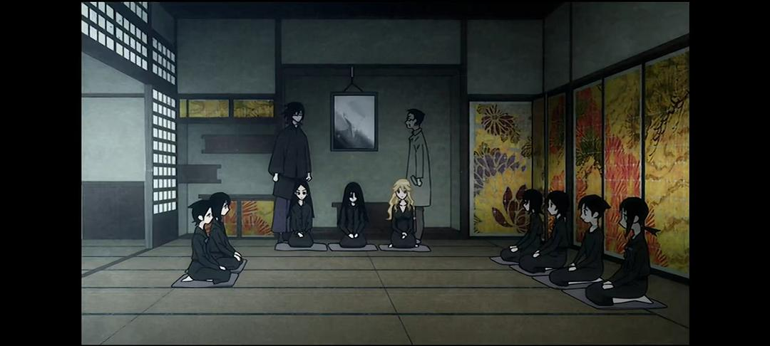 可看出众人坐位,正中间的遗像,右侧的屏风都是相同的。据说,当年拍摄《犬神家族》时,市川昆曾突然喊停,说摄像机拍不出金屏风的反光。