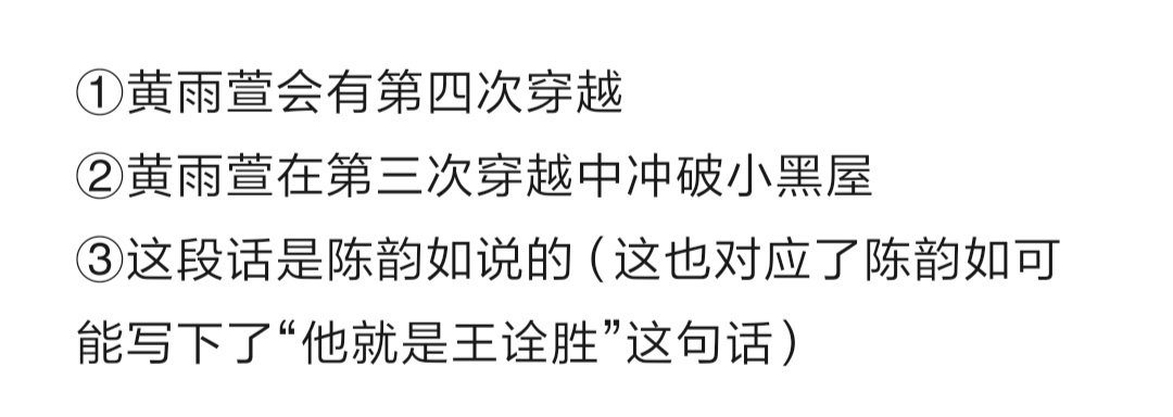 黄雨萱附体到陈韵如身上后,依旧是黄雨萱的性格,所做的事所说的话都是和陈韵如相反的,而2011年的王诠胜却说出了1998年李子维说过的话,说明王诠胜此刻的身体里是李子维,黄雨萱从头到尾喜欢的,都是李子维。