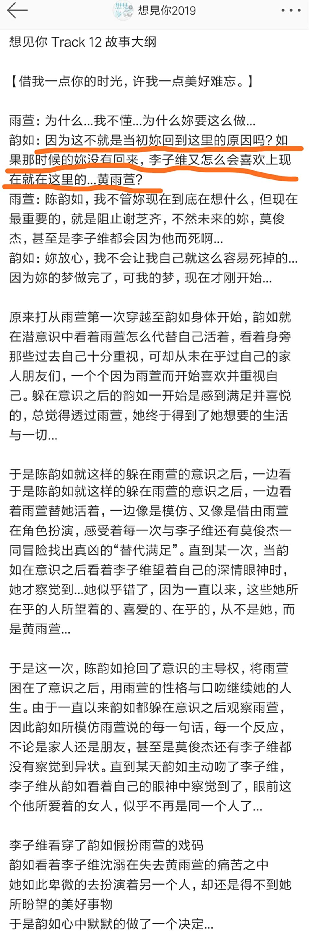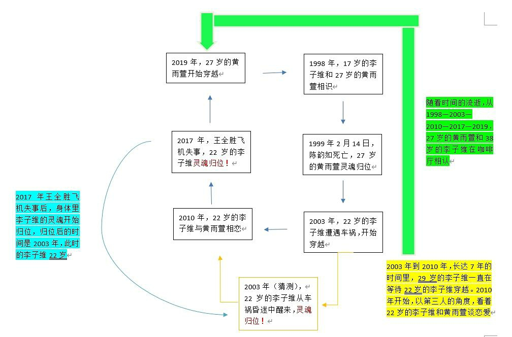 2019年,黄雨萱失去男朋友王诠胜(李子维)n→n2019年的黄雨萱穿越到1998年陈韵如身体里,导致了他人眼里的陈韵如性格大变n→n1998年的陈韵如(黄雨萱)发现了和自己男友很像的李子维,李子维也喜欢上了陈韵如身体里的黄雨萱n→n1999年的陈韵如(黄雨萱)被杀害n→n1999年的后悔莫及的李子维因为某种因素,穿越到2011年王诠胜的身体里n→n2011年,王诠胜(李子维)遇到了黄雨萱并交往n→n2017年,王诠胜(李子维)飞机事故去世n→n2019年,随着时间推移,变老的李子维出现在黄雨萱眼前,王诠胜的身体已经死亡。