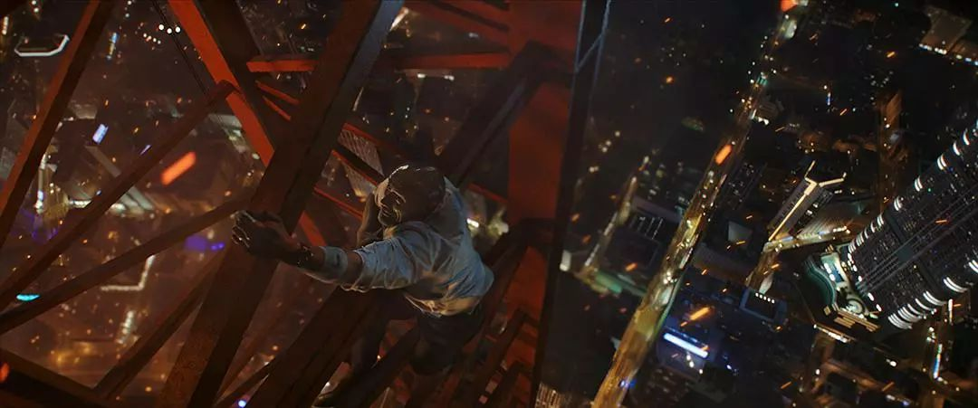 这时巨石强森已经被当作了大楼纵火的头号嫌疑犯。他逃过警方的追捕,爬上了明珠塔旁边的一座塔吊,利用吊臂跳进大楼,找到了他的家人。妻子正在与一名歹徒搏斗。这名歹徒是袭击者安插在赵员外身边的另一名内鬼。第一眼看到他,我还以为是本·门德尔森,心想着怎么这么巧,连续两周看的电影里都出现了《头号玩家》的反派。