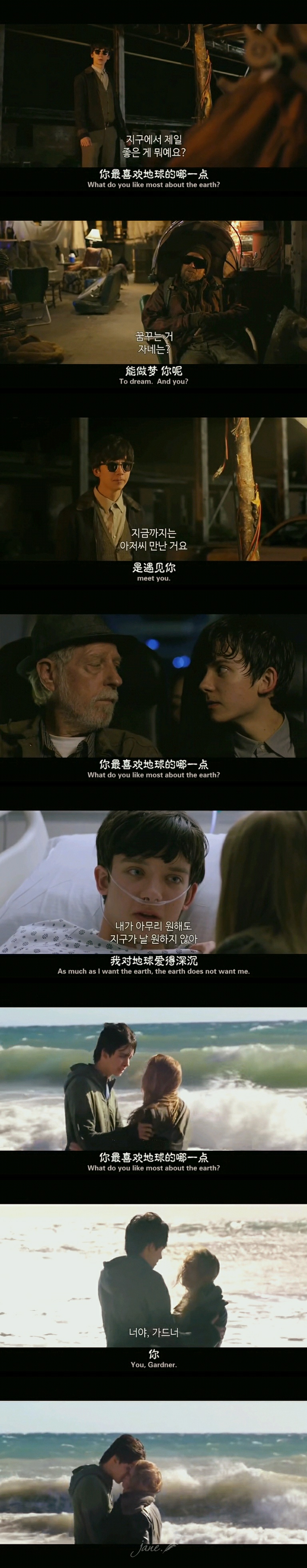#讲讲为什么带给我感动# 试想一下 你仅仅凭借一张照片 一个执念 一个约定 就来到一个陌生的地方 何况是一个陌生的星球 你拼尽所有 甚至性命 只要找到一个答案 可是迎接你的不仅是漫无目的的失落感 来自周围人的不信任与阻挠 还有来自地球的满满的“恶意” 你不能在地球存活 因为你的心脏天生就比地球人大 又患有骨骼不全症 忍受不了地球的大气和引力 你每走一步 都需要多一些的努力 这里Asa对于走路的细致刻画 给满分 甚至镜头最后切到海边 Gardner以为一切都结束了 找不到结果 生命也到了尽头 他想只要他来过这里就好 那句“I was here” 明明是满怀着期待与热爱写下的 却让人感到满满的心酸与可惜
