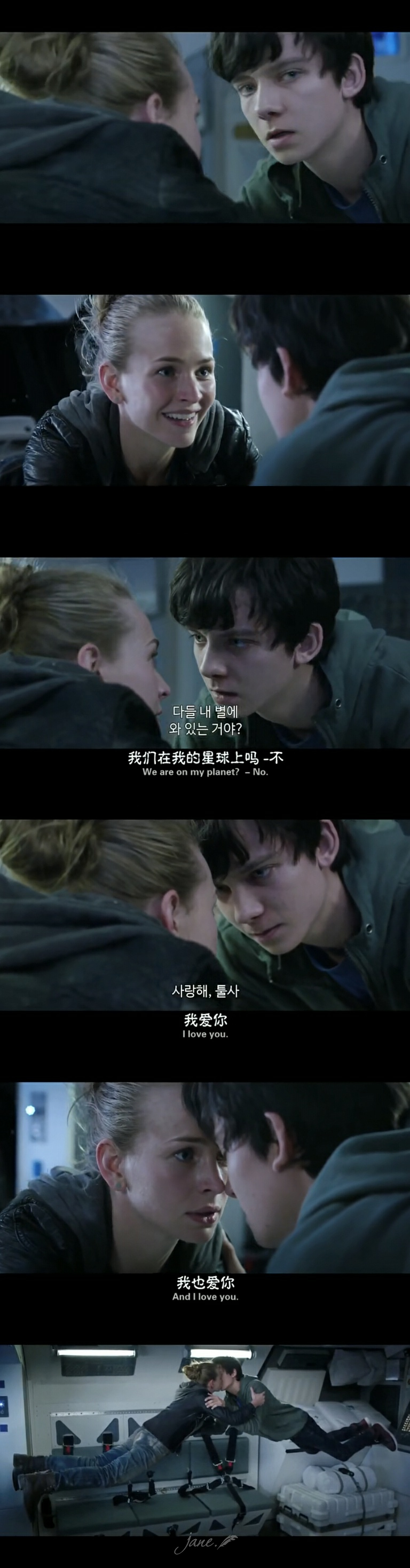 亲爹飞机都开到这个份上了他儿子肯定也得醒了,于是在太空中,他和女主浮在飞机里开始展开了一段我爱你你爱我的片段。