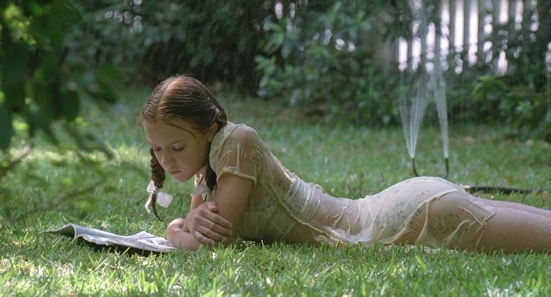 像《洛丽塔》中躺在草地上的少女,纤薄的湿衣紧贴着她的身子: