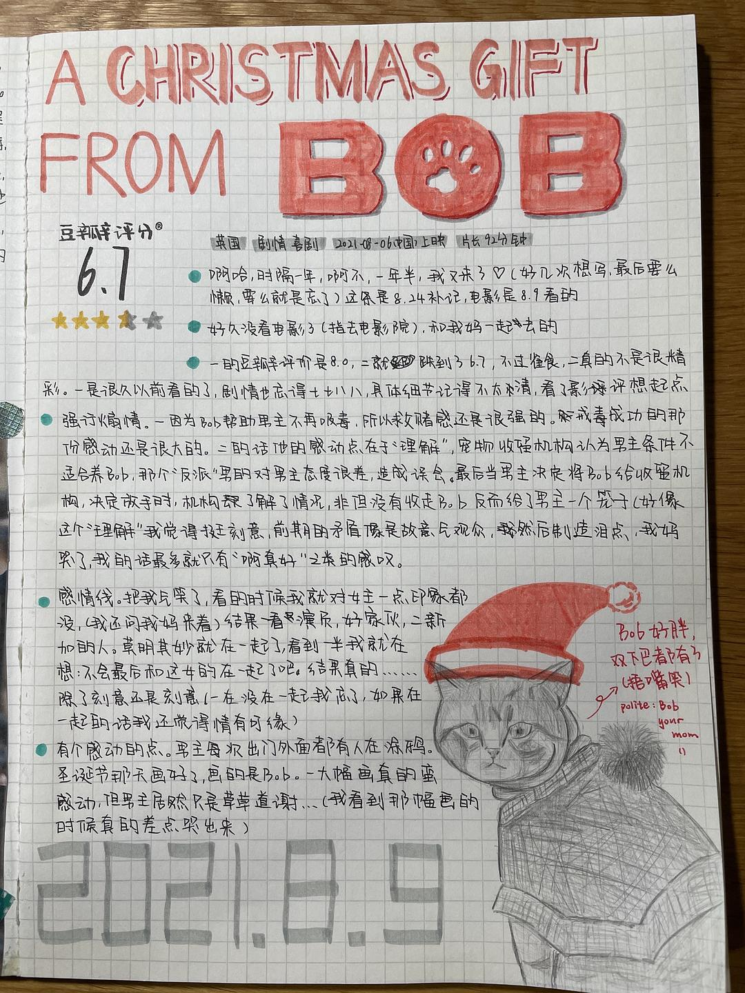 希望你也能遇到“鲍勃”,得意亦失意,都珍贵。偷偷带着这样平凡又真挚的情感,体会他们的爱,但请也别忘了回应。尽管他们从不像人类那样矫情,执着于双向奔赴。哈哈。