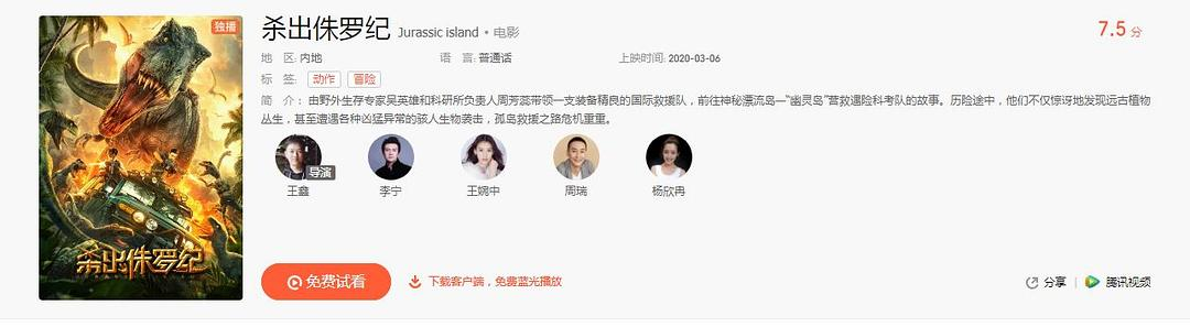 2020年3月6日,腾讯视频上映了《杀出侏罗纪》: