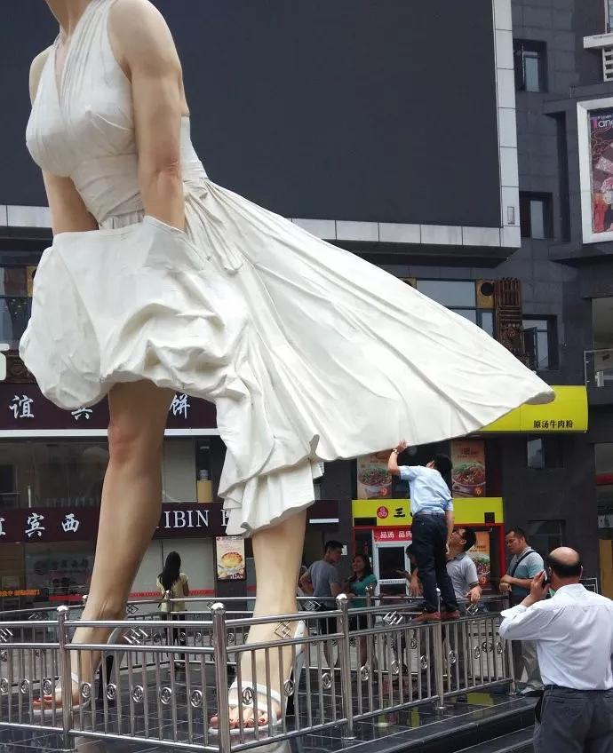 2014年6月,广西贵港,一樽玛丽莲•梦露雕像,构建之初就打出了“全世界最高梦露”的旗号。落成之后,人们争相簇拥在她的裙摆下,小心地窥探和议论着。
