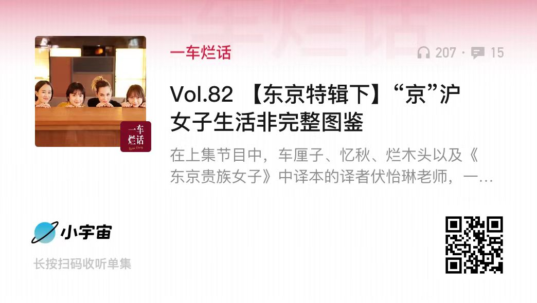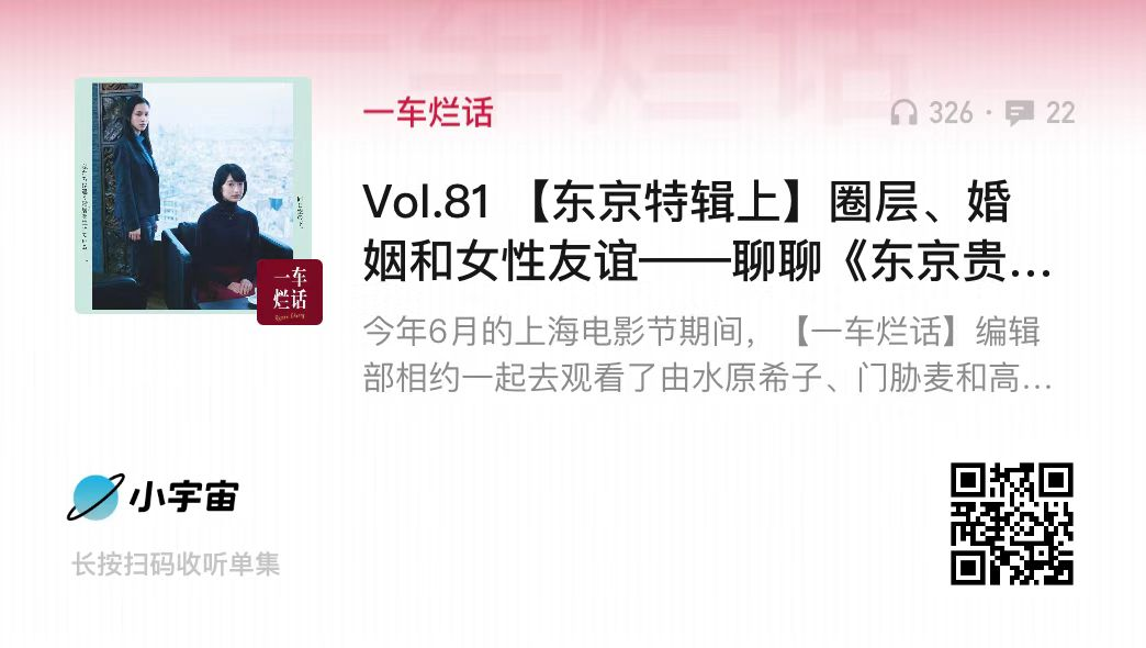 这是我台【一车烂话】的两期宝藏节目,我们与《东京贵族女子》的译者Feeling老师一起,畅聊了原著、电影,并对比“京”沪女子生活非完整图鉴。欢迎收听呐~!