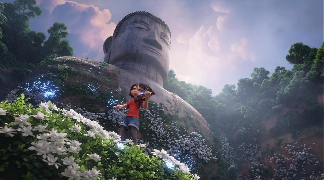 我很喜欢的另一段是在之后的乐山大佛。小艺发现自己完成了和父亲约定好的旅行,已经到过了每一个想要访问的地方,然而父亲却早已不在身边。在佛的掌心,她拉起被大毛修好后也拥有了魔法的力量的小提琴,音符将爱与思念散播在地上开出花朵,小艺的眼角流下泪滴,天空也下起了大雨,雨水在大佛的眼角滑落,仿若是佛慈悲的眼泪。
