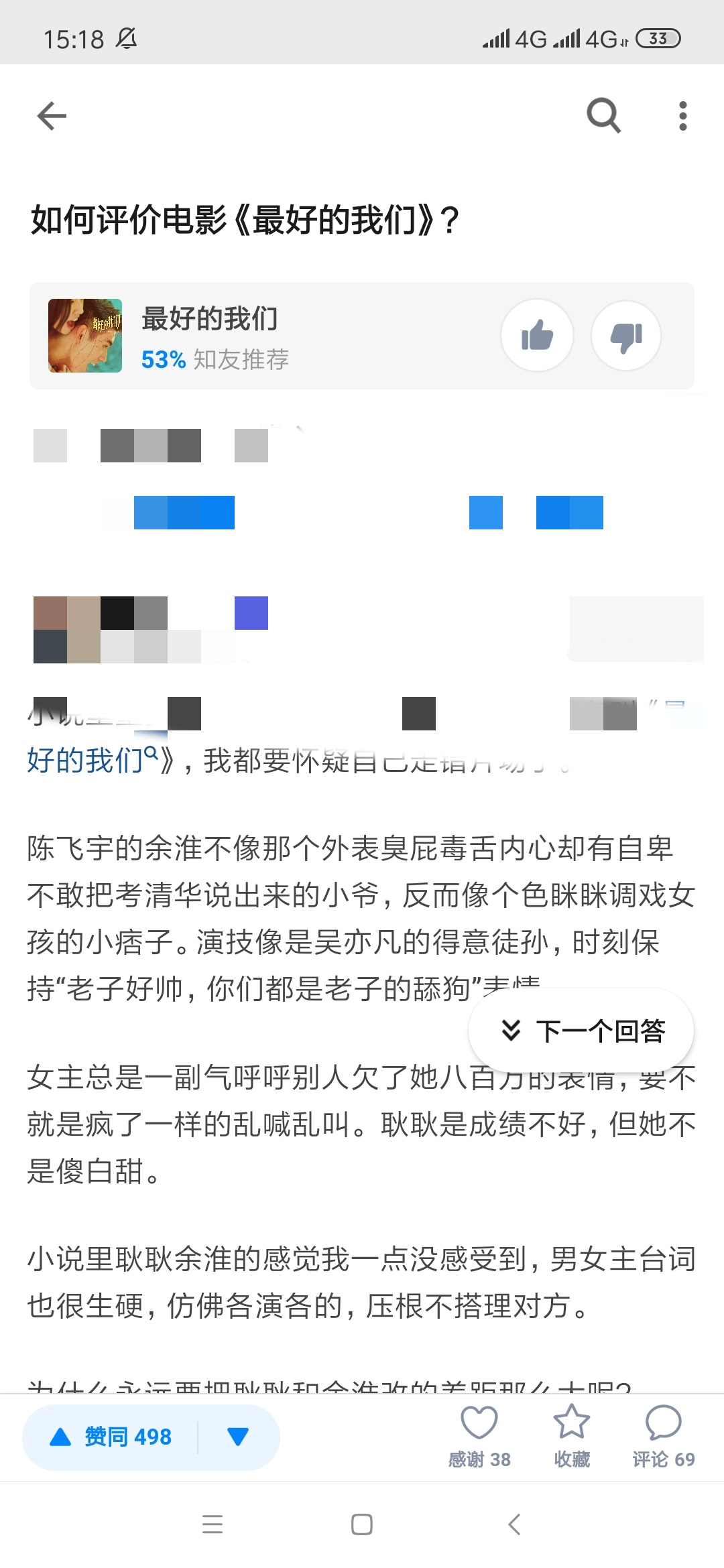 复盘一下《最好的我们》电影版吧,总之不论是书粉还是青春片热爱者,都十分不推荐去看这部电影。nn这部电影成为我第一部看十分钟就不耐烦想离开的电影,但为了能够相对客观地批评这部电影,我坚持坐到了最后。也是佩服我自己。nn从电影叙事上来讲,也不提小说的漫长叙事,整个叙事和情感表达就是支离破碎的,几乎没有一个情感点可以触动,每一个情感开始得莫名其妙也高潮得莫名其妙。n我觉得这部电影的弊病在于它贪图省事,不动脑筋扁平化叙事,任何需要揣摩的、需要让观影者领悟的细微情感变化都直接省略,也许是因为这部电影建立在极度有共鸣感的青春小说基础上,所以电影制作者一方面仗着原著而省略情感变化的细节,另一方面又因为这些细节太过耗时难处理而选择放弃进行模板化的扁平处理。所以整个电影都像是把观众当猴子耍逗着玩,以为观众看不出来,以为观众会流泪,以为观众会共鸣感动,包括雨中男同学给叶展颜弹吉他唱歌告白,我被这个电影里同学的欢呼围观与尖叫给白痴到了,只想翻白眼。nn总之,这一点都不是一部诚意之作。这部电影看完,我真正感到遗憾,电视剧电影好坏都已经拍完了,再也不可能有另外的《最好的我们》了,一种青春的形式再也不可能以“最好的我们”来展示了,然而展示出来的版本又实在是令人有些(。)nn电影开头那会说,余淮他狡诈尖酸刻薄,这是耿耿吐槽他的话,像是在一开始设定欢喜冤家套路,实在是过于模板化了,一开始就套进了一般青春片的叙事里。随后简单和贝塔说,余淮啊,令女生尖叫(大致就是这意思)。我看着电影,就在一直否定,不是的不是的,余淮不是那样的男孩,不是王大陆演的那种类型男孩,也不是江直树的那种男孩,也不是最近青春剧流行的高冷面瘫男。余淮不是令女生尖叫的那种男孩,他真的相当常见,成绩好一点脑子聪明一点的男孩,很接地气很会开玩笑,作业写得很快上课可以不怎么听,成绩很不错却也不是年级里最最突出的那些,在男孩和女孩里都受欢迎。是一种明知他耀眼却也不刺眼的光芒,八月长安说是“蓄着太阳能”。nn所以从陈飞宇这个选角开始就错了,陈飞宇太不接地气,他不像是能够融入人群插科打诨的人,甚至他在电影中的表现都像是从来没有做过普通男高中生(一种感觉猜测啊,不知道他的学习经历),上课坐姿就不像一个深谙应试教育之道并在其间混得如鱼得水(上课睡觉,有自己的学习节奏)的男高中生样。nn余淮这个人物,其实有点直男的。他绝对不会做出给耿耿剥了一整盘龙虾这种不符合纯情直男高中生的行为,也不会直接对着受伤的耿耿说“从今天起,就让小爷我罩着你”这种话。我觉得余淮是羞于去表达这些的,就算是要说,也只会假装心不在焉地说一-句“小爷我一直都在”,而不是有点正经地有些温柔地说这句话。nn耿耿这个人物,看着大大咧咧其实很羞涩的。她也不可能这么肆无忌惮有恃无恐,就像是早已熟知彼此心意。她其实一直诚惶诚恐,在各种事物之间矛盾纠结,也从不会如此对余淮如此笃定。nn他们之间原本就是《流水混账》,本就是细水长流的同桌故事,日子一天天浪费过去,竟然也就自得其乐开心得不得了,哪怕是有各种沮丧和失意,“我不幸是世界上最不快乐的那种人,没能力,却有上进心;没天赋,却有梦想;越努力,越难过。”这样的耿耿和“嬉皮笑脸地随手摘取你费劲九牛二虎之力才够到的神仙果,然后却表现出并不是很稀罕的态度”的余淮相差了十万八千里,可还是觉得“青春浪费在你身上”,也真是值得的一件事。这样的日子又怎么会去如此热烈和直接地表达情感呢,怎么余淮就会去说“我也有个喜欢的女孩,我也想在舞台上唱歌给她听”这种话呢。这个故事真的不是电影里刻意煽情地演唱《勇气》一样勇敢,这不是一个勇敢追爱的故事,他们会会绝口不提喜欢,各自隐藏着继续同桌生活。