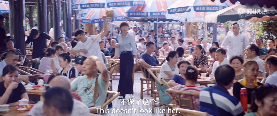 出完字幕,故事正式开始,长镜头继续,出场人物给了一句背景音一样微弱的台词:“到里面看看去”(四川口音,确定是成都人民公园相亲角)