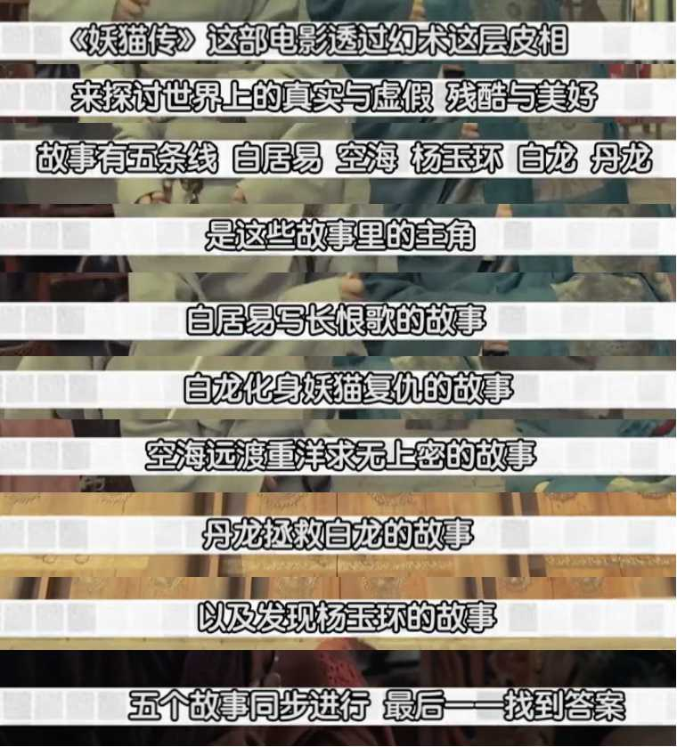 n2.大唐白居易在《妖猫传》里涌动的灵魂nnnn我是带着对《长恨歌》里bug的疑问坐在电影院里的。nn电影的前半部分气势如虹,情节紧凑,环环相扣。用查案和悬疑把胃口完全吊起来了。nn杨贵妃出场之后。绚丽的视觉效果把大唐盛世渲染到极点。虽然有一些超自然的部分,但是用阿倍仲麻吕的回忆滤镜和影片的幻术设定,都还是圆的过去。nn最后三十分钟,情节崩了。古怪之处很多,这个稍后再谈。nnn但最最让我感动的部分是,我终于能够体会到白居易在创作《长恨歌》时候的感情。《猫妖传》把《长恨歌》曾经给我的感动,在大银幕上乘以二,还给了我。nnn首先,电影终于合情合理地拆穿了唐玄宗的真面目。nn《长恨歌》里,玄宗对杨贵妃之死的反应是:“君王掩面救不得,回看血泪相和流。”把这一幕想象成画面,多么像演给别人看的!假假假!贵妃之死又不是一秒内发生的事情,哪来的掩面救不得?玄宗掩面的时候,到底在想什么?是悲伤?是如释重负?嘴角可有一缕笑意?nn《妖猫传》把这段真实的唐玄宗都演出来了。贵妃的死,就是唐玄宗本人安排,甚至是欺骗的。为的是什么?为的是皇权的威严不要进一步流失,既要让自己显得没那么薄情寡恩,又要维持着天子形象,不能是一个被乱军逼迫之人。也难怪这时的叙述者,用一种嘲笑的口吻说:“他才是真正的幻术大师。”nn对杨贵妃这里的还原也是可圈可点。张榕容饰演的混血杨贵妃,在生命的最后关头,已经看透了一切。她知道这是骗她赴死的手法。她面对这个解决方案的时候,脸上面无表情,就是已经对这一屋子的男人彻底失望。她没有做任何的告别,没有对玄宗含情凝涕,梨花带雨,只是嘴角挂了一抹嘲讽的笑,喝完酒,没有说一句话,决绝地上楼赴死。nn心死之人,大致如此。这时她的反应,无愧于她贵妃的身份,她是一个真正的高贵之人。
