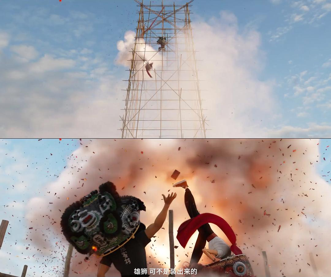 当然,电影并未一直都是对真实景观的复原再造,其他段落中同样有着“非现实”的气质:比如开场的高架采青,两头狮子以超越凡人的架势无视物理法则和人体构造上下翻飞,虽说这是动画,但未免也太过离谱。