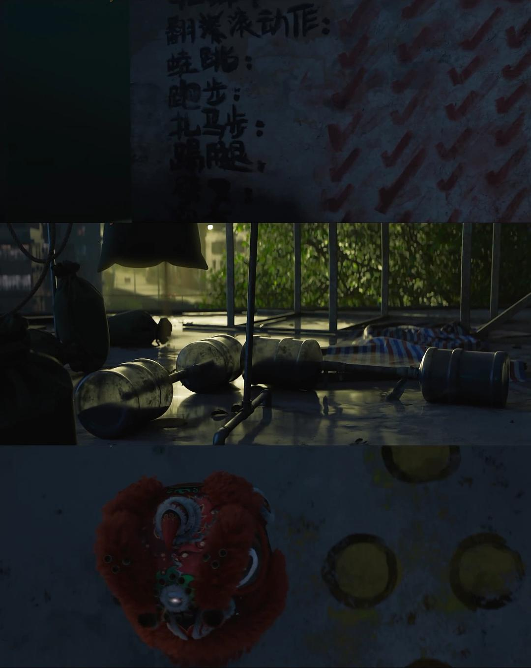 同样在《雄狮少年》中,技术与美术的背后有着扎实的文本支撑。第二幕的情绪积压到顶点后,观众迎来了全片的高光时刻:前往上海之前,阿娟来到屋顶独自舞狮。墙上的锻炼计划,地上的梅花桩图案,以及杂物堆叠起的高台,都在诉说着他从未放弃的事实。开始独舞,步伐从生疏磕碰到行云流水,分镜也在不断积蓄能量,当狮头冲破黑暗迎接朝阳时,观众与角色真正达成共感,以动作发出的无声呐喊也瞬间停顿。