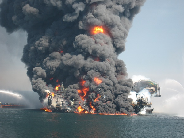 出事时候在第一层,油往上喷,造成第一次爆炸,之后通过安全措施抑制住了30秒…对只有30秒。第二次爆炸直接把整个钻油平台给炸了。其中他们也用了各种措施,但是由于油势太猛全部失败。而第三次爆炸是因为泄漏的石油挥发成气体,和发动机发生摩擦炸成了爆炸,这一次就可要命了,火光冲天。整个钻油平台算是完了。