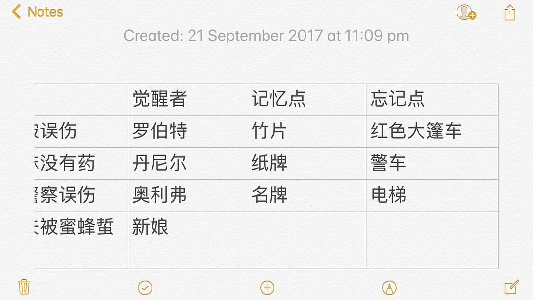 手机上的Note随手写的,不太整齐,大家随便看一下,我会仔细说明。nn我来说明一下,这部电影中一共讲了4个序列的故事,第一个细节不够多,但没关系,逻辑足够清楚,第四个序列只写了个开头电影就结束了,也没关系,逻辑是一样的。只要理解了这些序列之间的逻辑,不光是下一个序列,列无穷个序列下去是一样的。nn这几个序列是有联系的,但也不见得是必然的,这是电影标题incident想说明的一点之一。这点要提前说明,即:每个人物的命运彼此纠缠,但这是意外导致的结果,不是必然,也就是说,和每个人物命运纠缠的也有可能是别的一些人,不是电影里写的那些人,主要取决于发生的意外是什么。nn根据刚才的表格,我来按次序写一个详细说明。nn序列1 渔夫序列 年少时的罗伯特和渔夫一起度过了35年,渔夫失手导致了罗伯特朋友的死亡,而罗伯特因为朋友死了自己活着感到很自责,渔夫死前告诉罗伯特,不要忘记自己是谁,写在小红本上(这是隐喻1,后面会做详细说明,也是因为这些隐喻,我认为这是个哲学片),同时他拿上竹片(隐喻2),好提醒自己。而且千万不要上红色的大篷车(这是隐喻3);nn序列2 罗伯特序列 年少时丹尼尔和继父罗伯特,妈妈,妹妹一起去海边看望父亲,罗伯特失手搞坏了妹妹的哮喘器导致妹妹死亡(又一个过失导致死亡),而丹尼尔没有带上妹妹的哮喘器,一直很自责(和年少罗伯特相同的自责),和罗伯特一起生活了35年,罗伯特死之前告诉丹尼尔,不要忘了自己是谁,把名字写在小红本上(隐喻1),丹尼尔带上了自己的纸牌(隐喻2),同时罗伯特告诫丹尼尔尔千万不要上警车(隐喻3);nn序列3 丹尼尔序列 年纪最小的奥利弗在警探丹尼尔的威胁下承认了哥哥的罪行(应该是兄弟俩一起犯下的),丹尼尔失手打伤了哥哥导致了哥哥的死亡(第三次过失致人死亡),奥利弗对哥哥的死亡感到自责(又是自责!)大概也有出卖了哥哥的自责成分在里面,奥利弗和丹尼尔一起生活了35年,丹尼尔死前所说的话和罗伯特的叠加在一起,很长的一段对白,这部分放到后面说,和前面一样,丹尼尔告诉奥利弗,不要忘了自己是谁,写在小红本上(隐喻1),一定要记得自己的名字(隐喻2);千万不要进电梯(隐喻3);nn序列4 奥利弗序列 新婚的年轻夫妻,坐进了实际上是奥利弗但名牌上写着卡尔并称自己是俄罗斯的lobby boy的电梯,奥利弗出来后放出了不知道哪里来的蜜蜂,蜇到了对蜜蜂过敏的新郎,奥利弗有意摔碎了包里的过敏药,新郎看上去也快死了,电影就在这里结束了,但可以推断,新郎是新的过失致死受害者,新娘一定又会自责,从片头片尾出现的老新娘,大概可以推出,新娘也陷入了和之前一样的循环。nn在这4个序列中,每下一个序列的加害人,就是上一个序列的间接受害者(因同伴死去而自责不已),而这些间接的受害者又变成了下一个序列里的加害人,这种地狱式的嵌套齿轮将像永远机一样无休止的运转下去。nn接下来我会按照自己的理解讲一下这些齿轮是如何通过一个小关节同时运转然后再也停不下来了的,这个小关节的标志就是那一声爆炸声,只要爆炸声一响,就像地上开了一个洞,所有人会一齐掉进这个深渊,也就是意外空间。那么这声爆炸到底代表什么呢?nn我们先回到片中虽然繁多但其实归类起来只有两类的元素,一类是记忆元素,一类是忘记元素