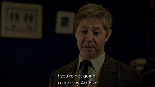 除去最为核心的字谜部分(下面会详细说),不足30分钟内的其他台词也常常有着字面之外的含义和背景,比如Tyler在最后为Nigel教授留下自尽的子弹时所说的"Never show a gun in Act One if you're not going to fire it by Act Five"(如果你不打算在戏剧的第五幕开枪的话,就没有必要在第一幕里用上枪这个道具了),正是来自于Anton Chekhov(俄国剧作家和短篇小说作家)所说的一句话,原话是”One must not put a loaded rifle on the stage if no one is thinking of firing it”,同时也呼应了剧集开头Nigel教授解释那把空枪是来自戏剧《海鸥》的道具,而《海鸥》的剧作家正是Anton Chekhov。