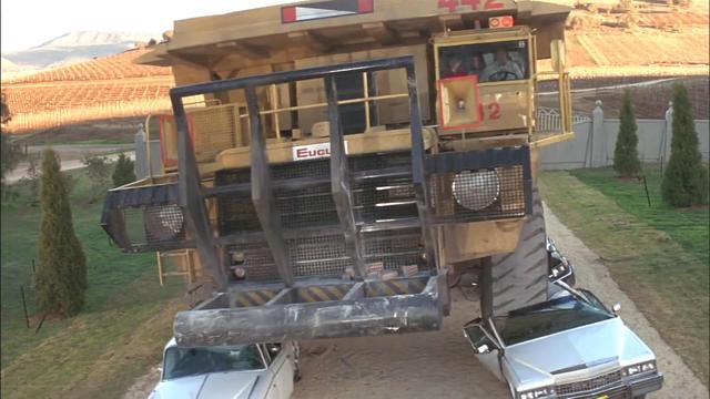 一路碾压,压坏了金卡罗的跑车,撞倒了别墅,金卡罗等人也被铲车追击受伤倒在了地上。
