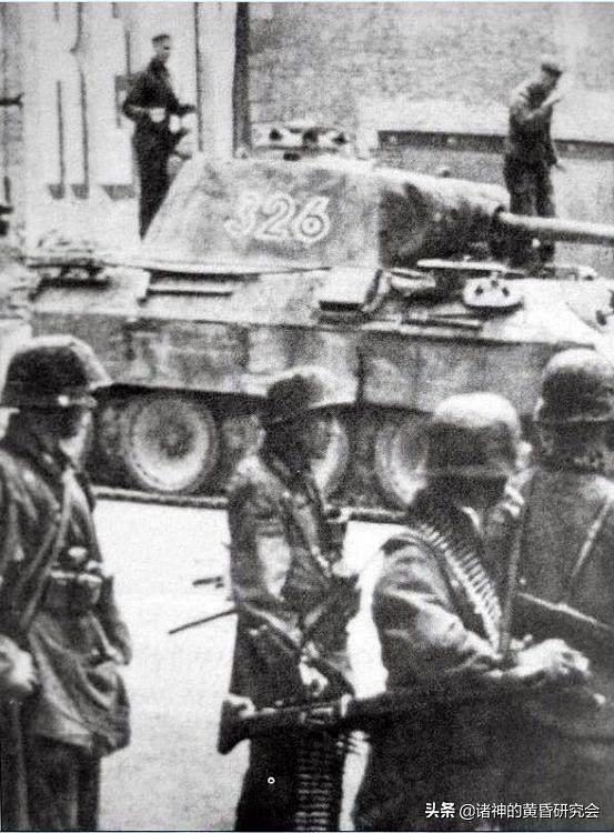 片中的豹式坦克正面装甲前沿绘有党卫军第12“希特勒青年”装甲师(12. SS Panzer-Division "Hitlerjugend")师徽。